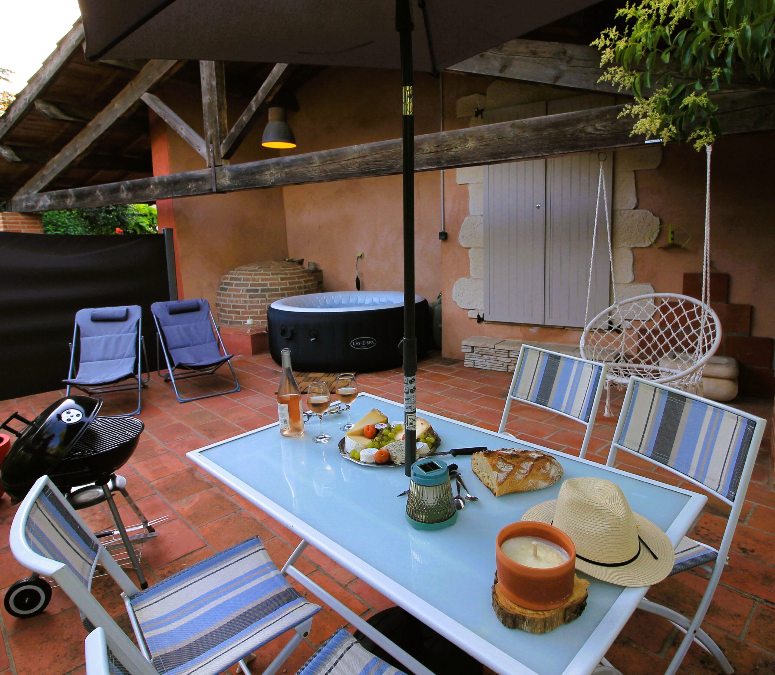 🛁 Jacuzzi privé : Détendez-vous dans le jacuzzi situé sous une terrasse couverte, pour un moment de relaxation ultime et d’intimité.